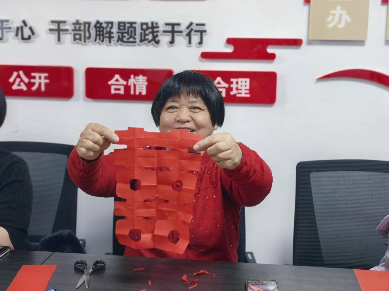 参与剪纸活动的居民向大家展示自己的作品。董亚茹摄