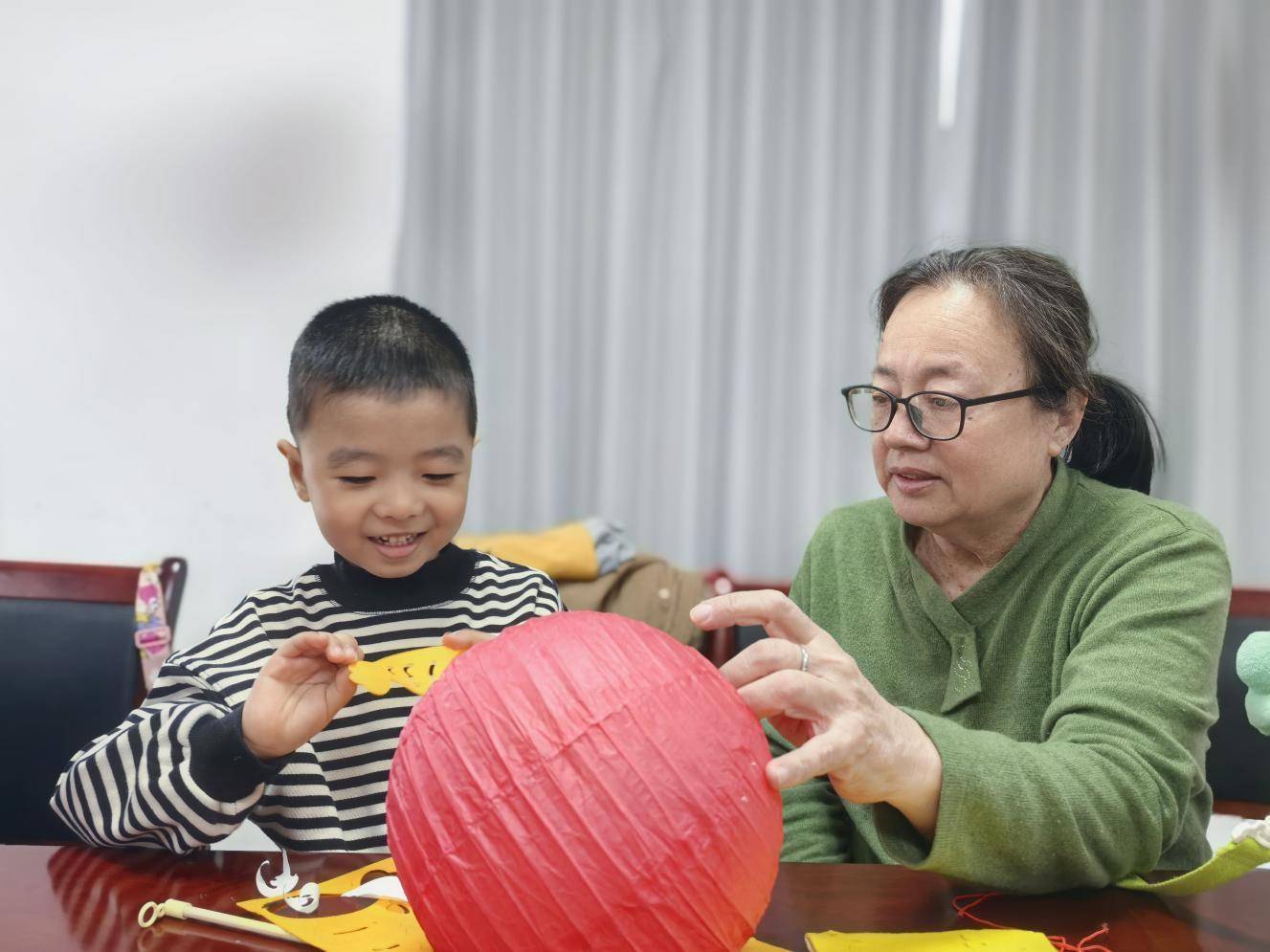 小朋友在奶奶的帮助下点缀灯笼。董亚茹摄